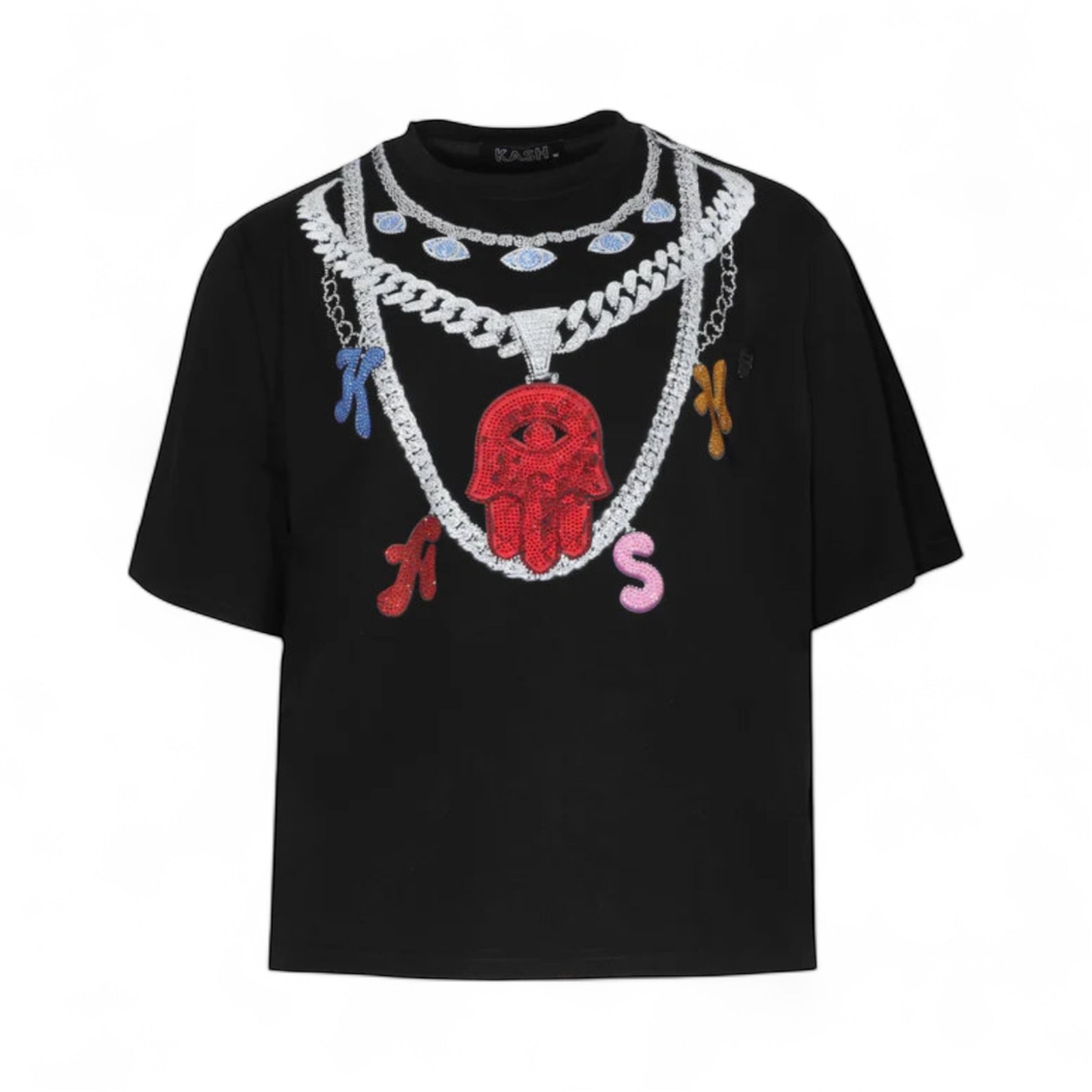 Drip without trying in the KASH “Iced Out” Tee — a statement piece that fuses luxury design with streetwear energy. Crafted from premium heavyweight cotton, this black tee features intricate rhinestone detailing that mimics layered iced-out chains, complete with the signature red Hamsa pendant and KASH lettering. With its relaxed, boxy silhouette, it brings confidence, comfort, and undeniable shine to any fit.